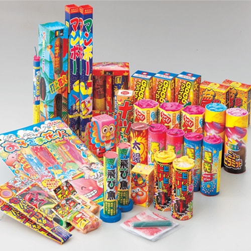 手持花火28本、線香花火9本、噴出花火19本、打上花火5本、連発花火1個、回転・走行花火3本