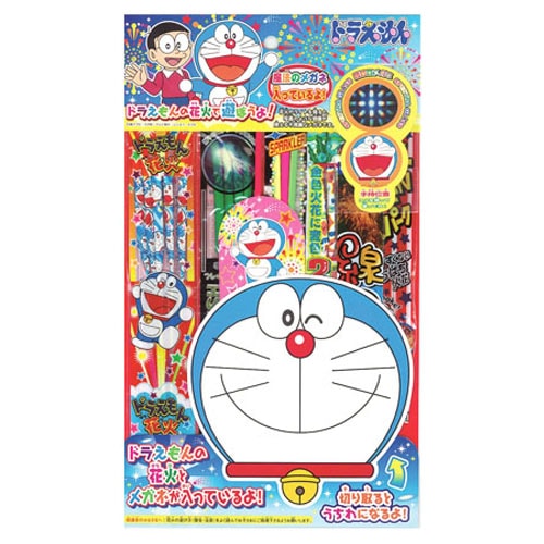 - ドラえもんとのコラボ商品!手持花火と線香花火だけの花火セット。絵型花火はドラえもんがデザインされたオリジナル品!切り取ってうちわにもなる台紙が入って、花火がさらに輝く不思議なメガネ付!