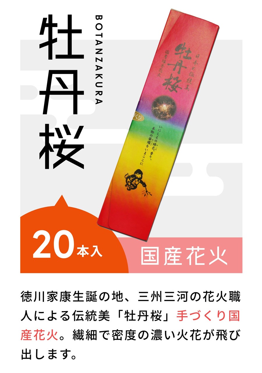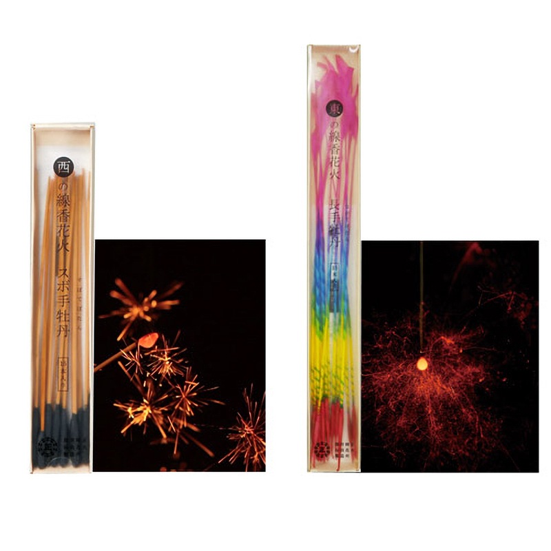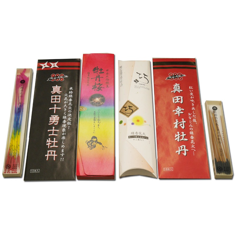 国産の「牡丹桜」、「巧」、弊社オリジナルの古きよき線香花火を再現した「真田十勇士牡丹」、色付き火花が吹き出した後に従来の線香火花へ変化する「真田幸村牡丹」、最も美しい線香花火を生み出したことで話題の筒時正謹製「東の線香花火」、「西の線香花火」、究極の線香花火たちが揃った贅沢な詰め合わせです。