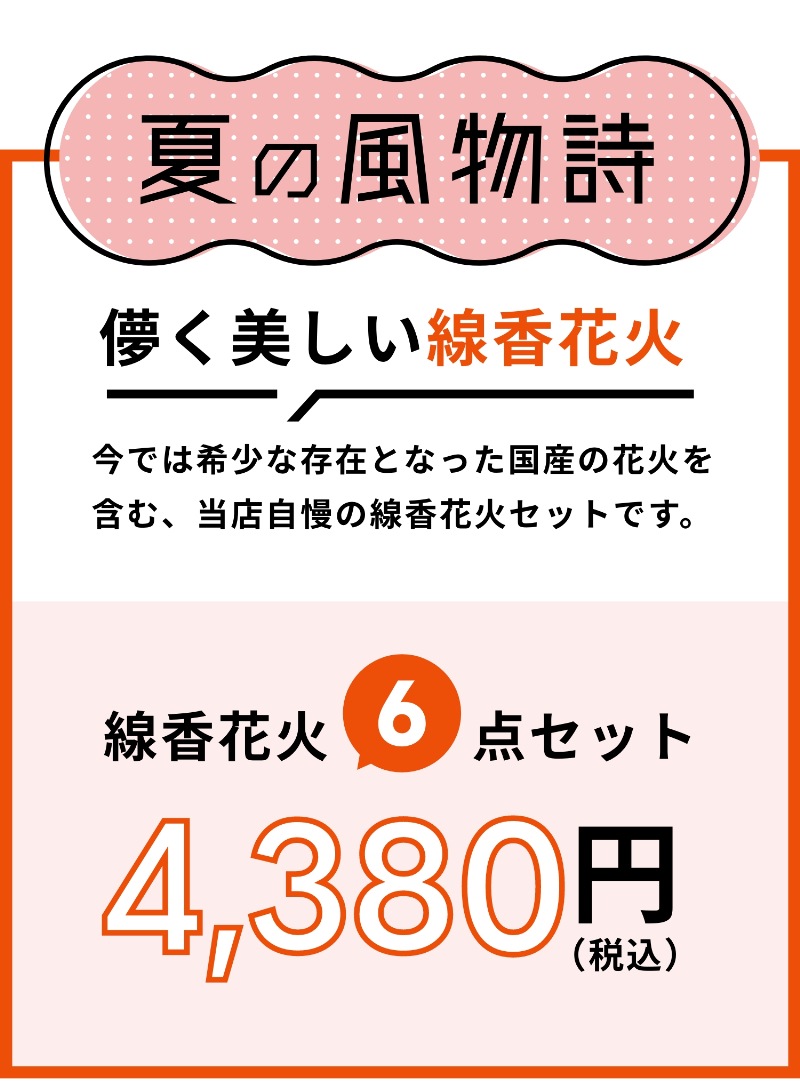 - 古来から人々の心に寄り添い続けた線香花火。その癒し火花を存分に楽しめるセットです。