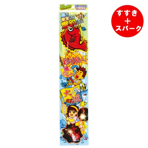 - 先端に点火すると、スパーク(金火花)が出て、途中から別の吹出花火(赤火花)に点火され、2つに分かれて金と赤の「めで鯛!」釣り花火です。