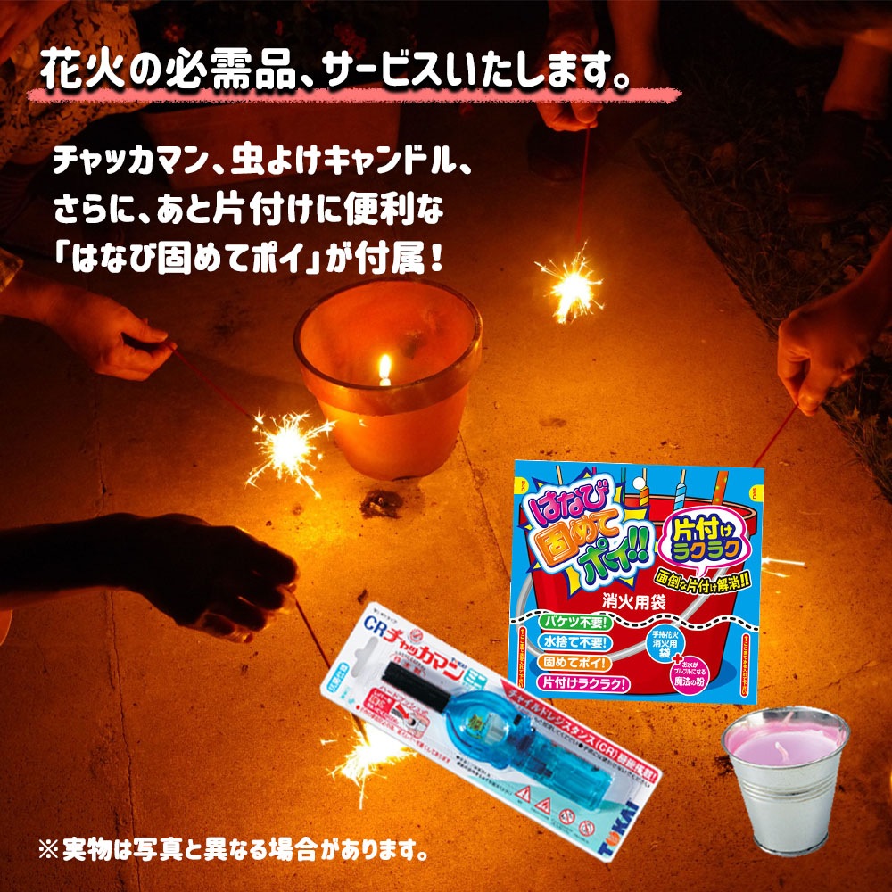 - 手持ち花火のセットだけを詰め込んだお買い得品です。さらに、チャッカマン、キャンドル、はなび固めてポイをお付けいたします。