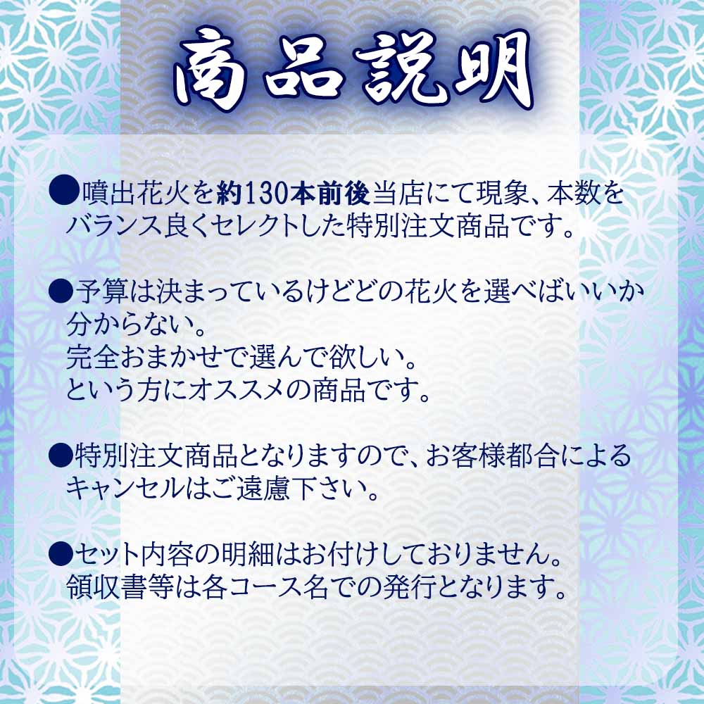 噴出花火を約130本前後、現象・本数をバランス良くセレクトした特別注文商品です。