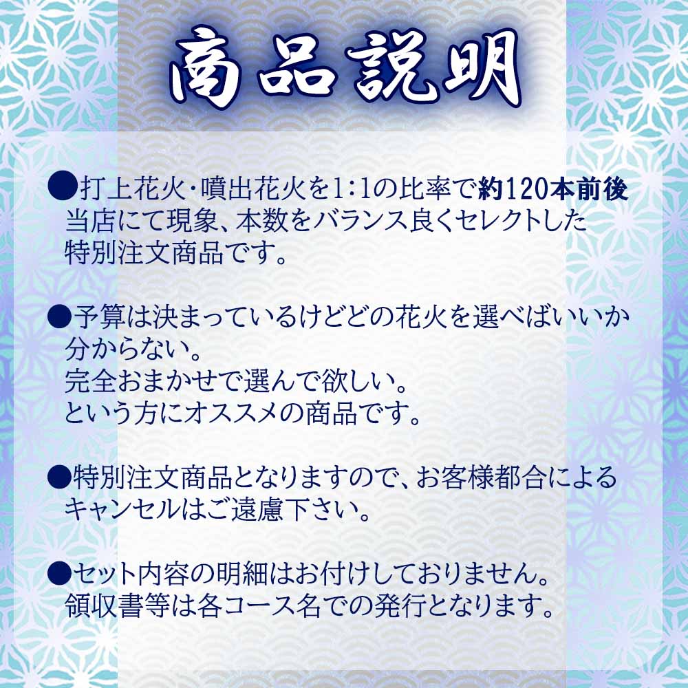 打上花火・噴出花火を1:1の比率で約120本前後、現象・本数をバランス良くセレクトした特別注文商品です。