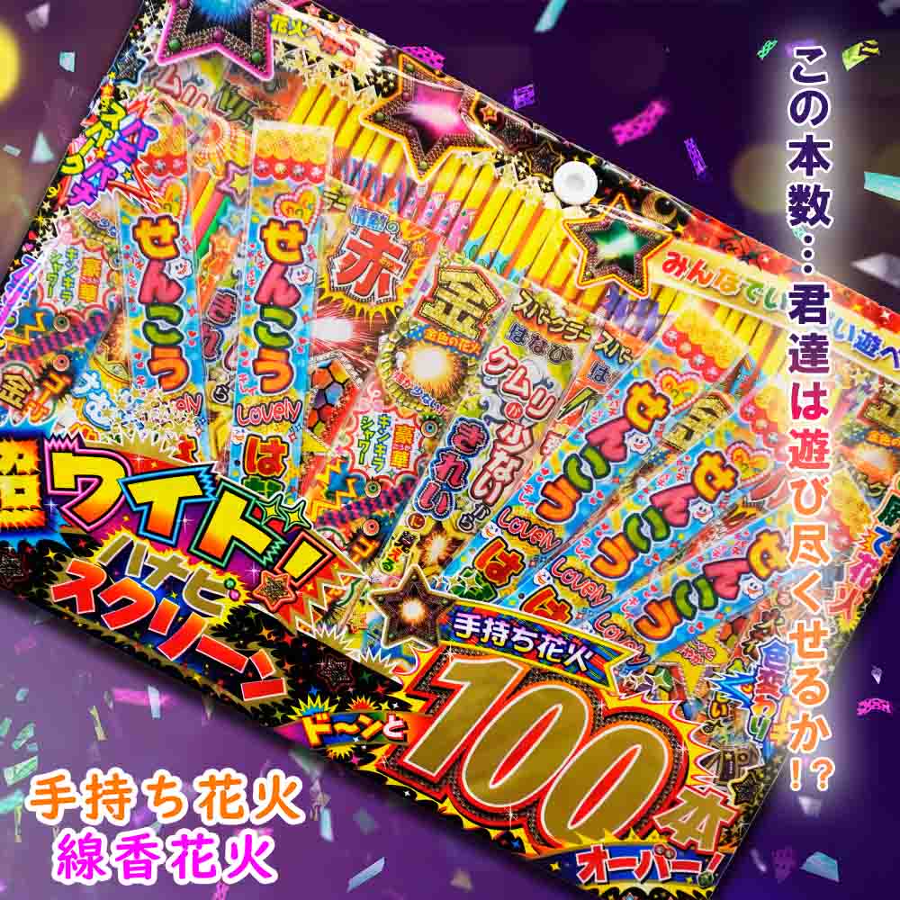 - 総本数100本超え!!パチパチスパークやドキドキ色変わりする花火が入って皆でいっぱい遊べるボリューム感満載のセットです!