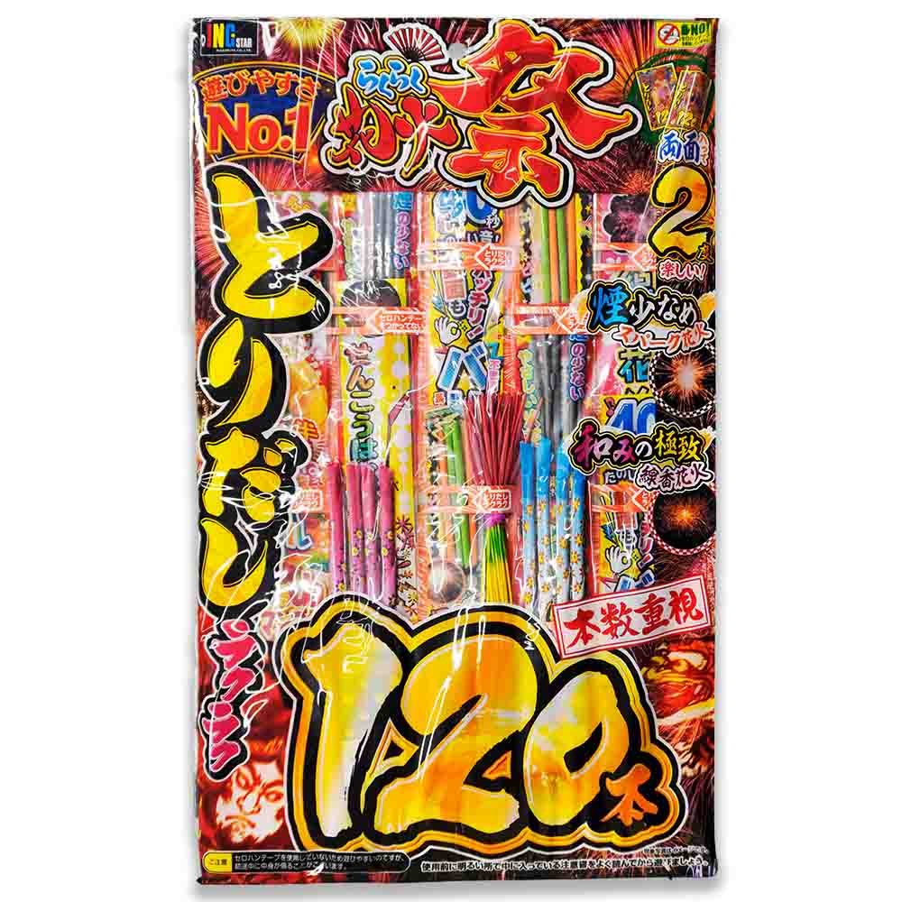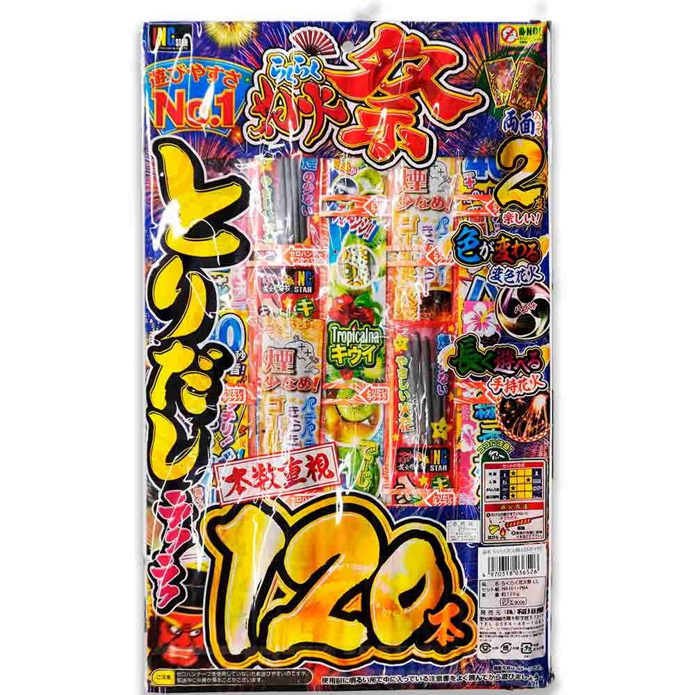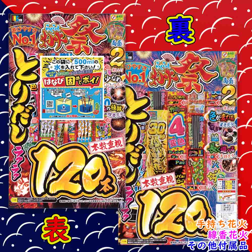 - 取り出しやすい『NO!セロハンテープ台紙』に両面合わせて手持花火がたっぷり120本。